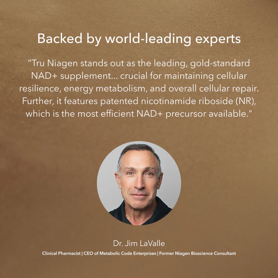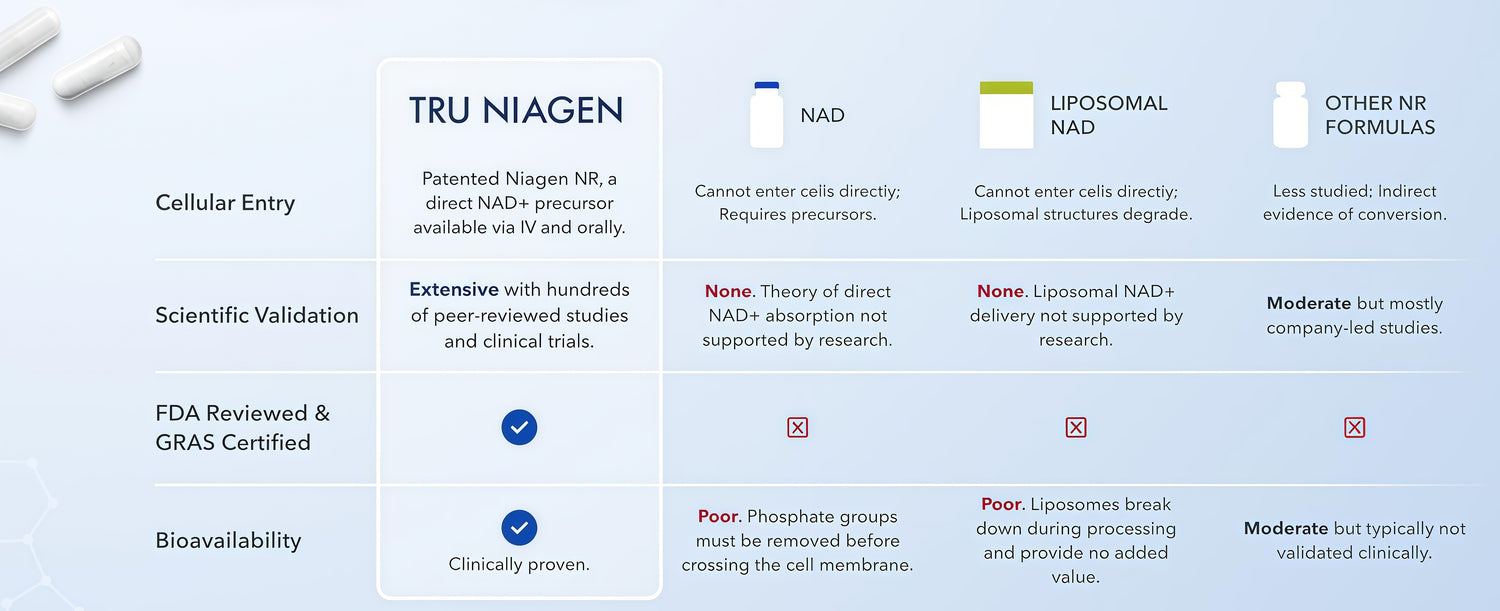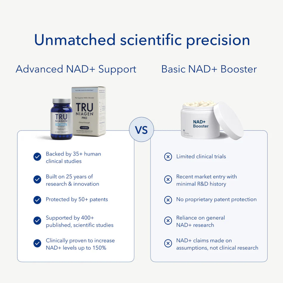 Tru Niagen is a superior choice compared to other NAD supplements because it contains Niagen®, our patented nicotinamide riboside (NR), a more bioavailable precursor to NAD+. Niagen® NR is backed by 35+ human clinical studies, and crosses cell membranes easily and is more efficiently converted into NAD+ inside cells, effectively boosting NAD+ levels.